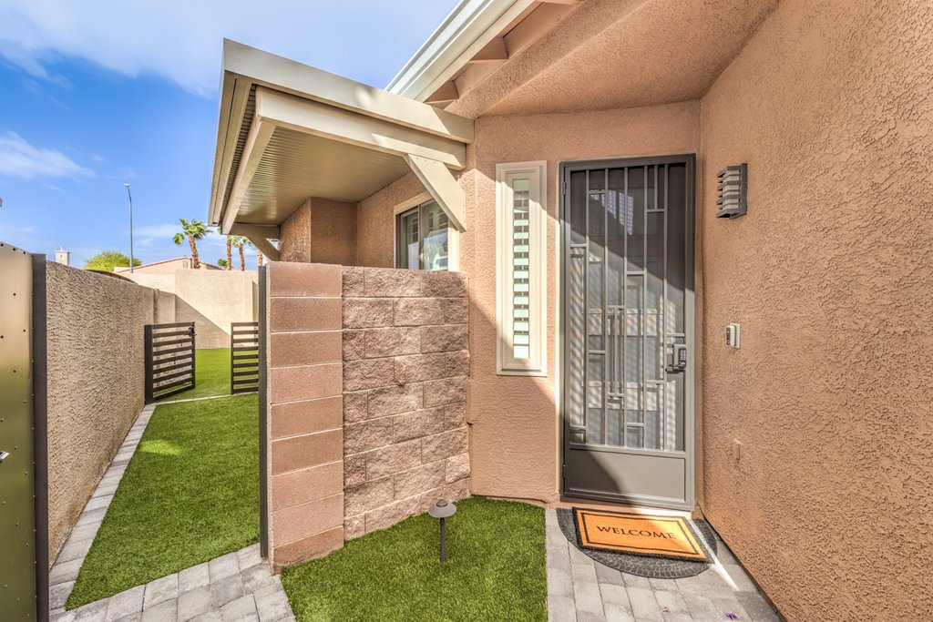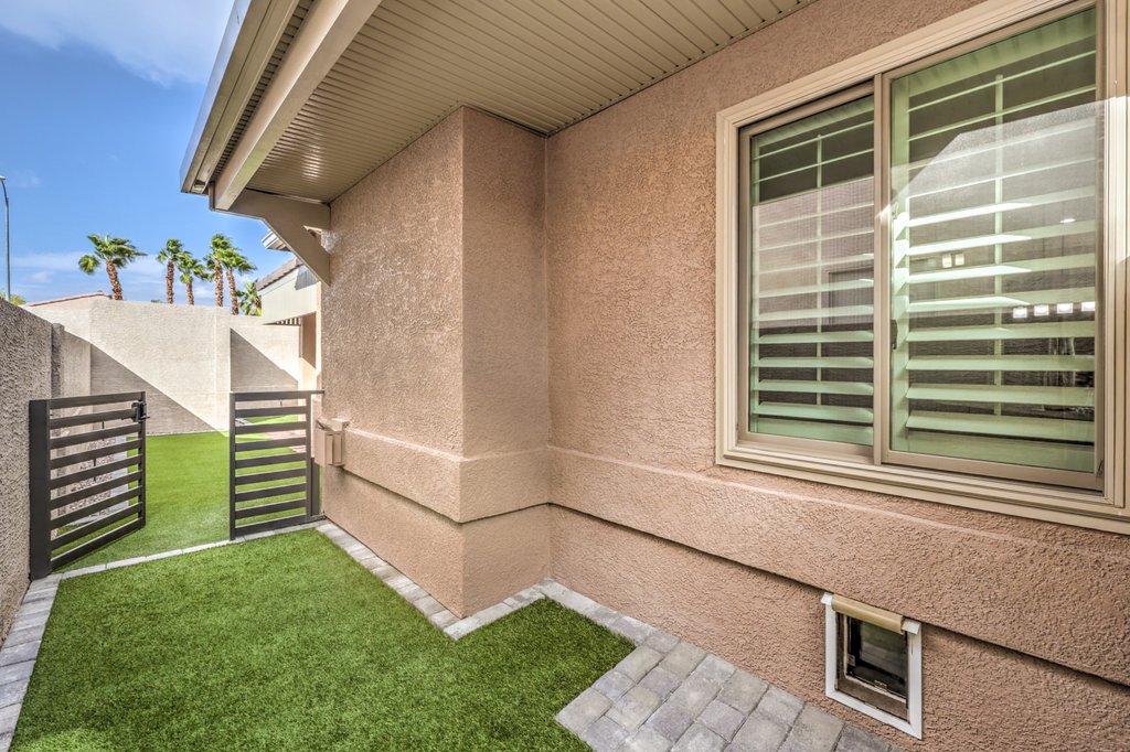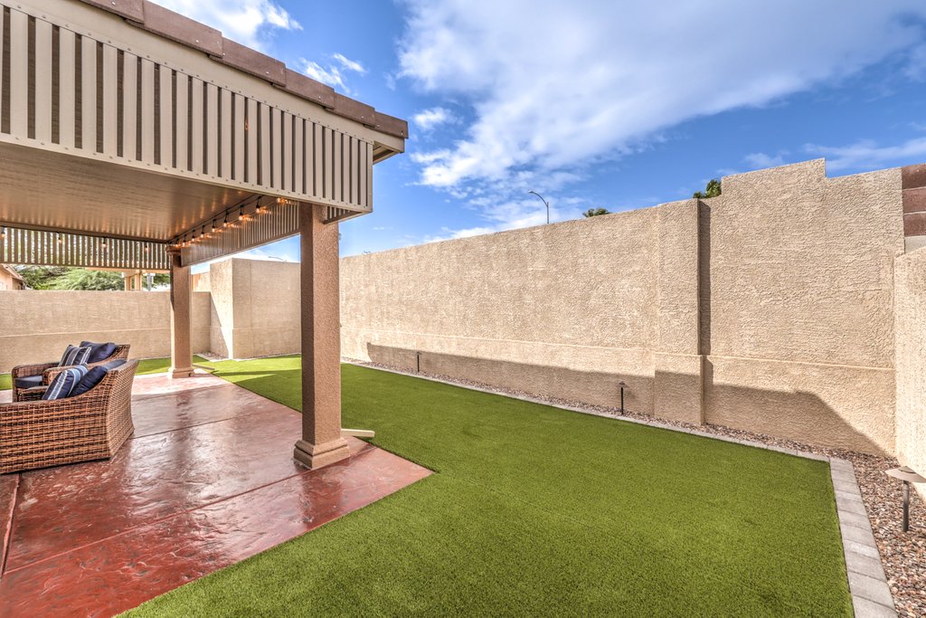 - Stamped Concrete, Covered Patio, Power Sunshade, Turf, Custom Gates